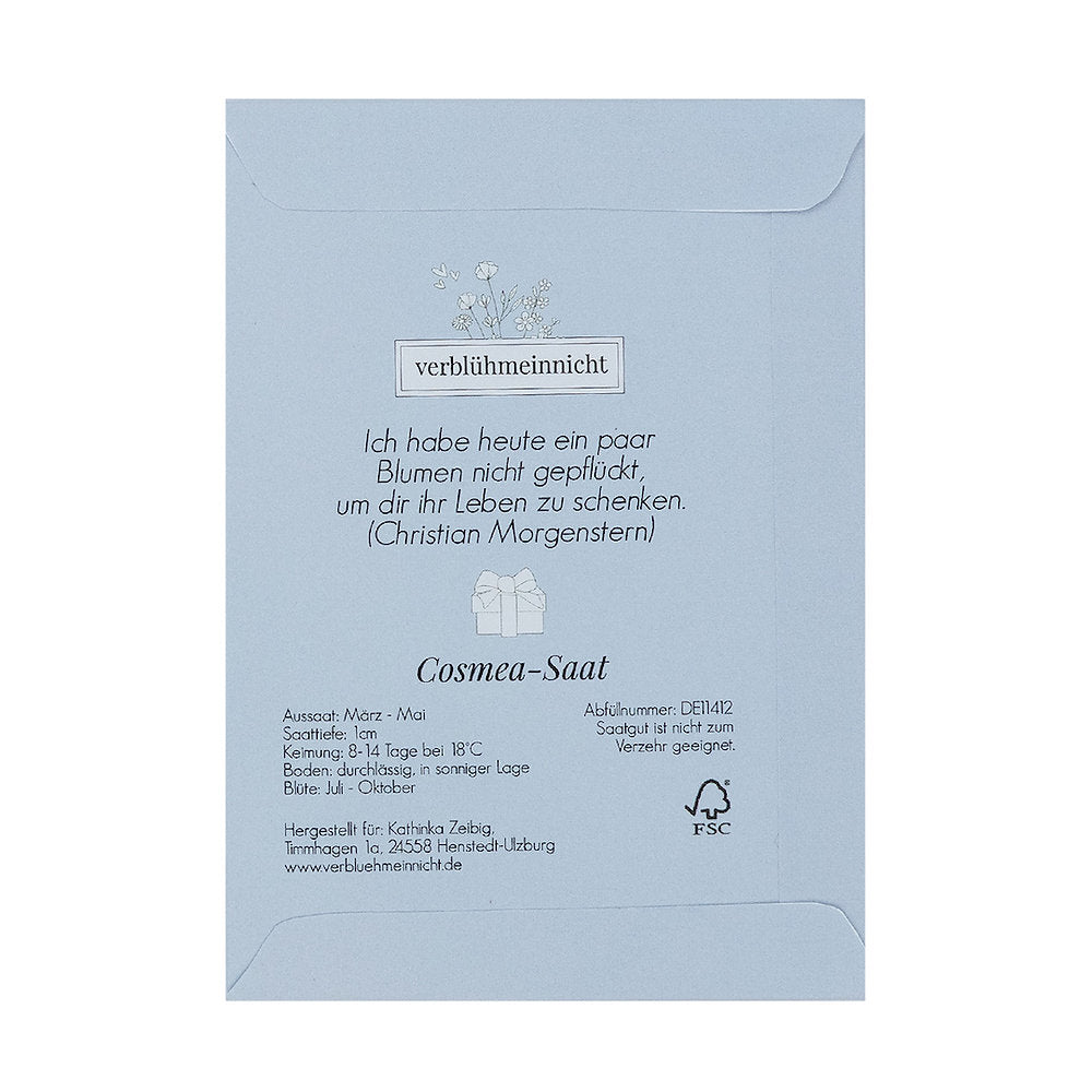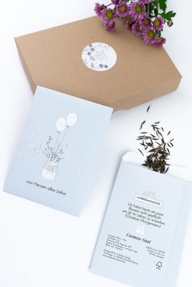 Wenn du die Blumensaat an deine Liebsten verschicken möchtest, empfiehlt sich ein kleiner mit Papier gepolstertert Umschlag oder ein flacher Mini-Karton. Ein normaler Briefumschlag empfiehlt sich nicht für den Versand, da durch die hohe Druckkraft der Pressen in der Post die Samen zerdrückt werden, das Papier beschädigt wird und die Samen ihre Keimfähigkeit verlieren.