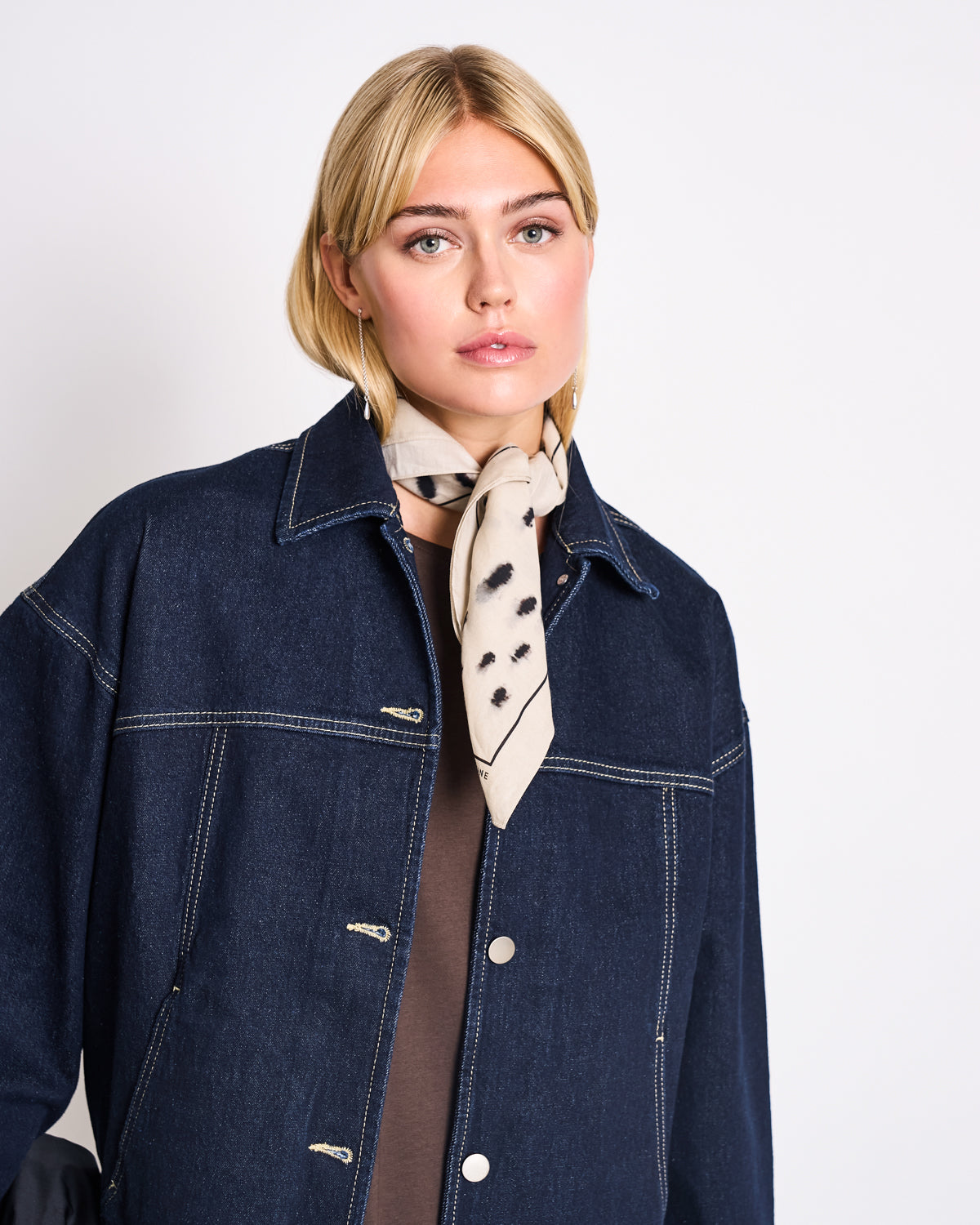 This scarf has a classic square shape with an all‑over print and a small logo placed in one corner. It measures 65 × 65 cm.