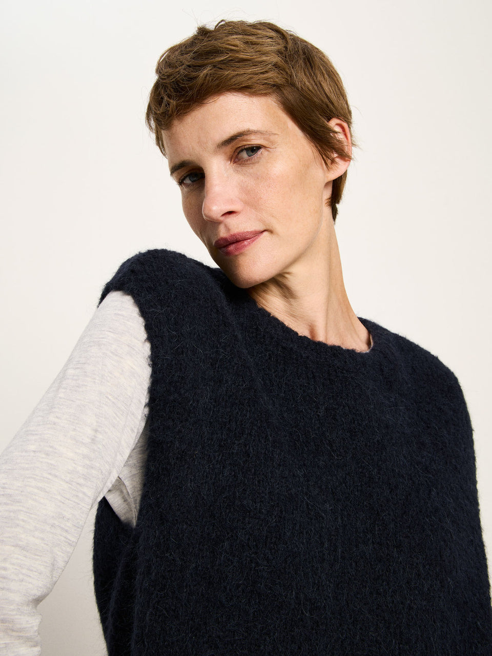 Dieser Pullunder aus hochwertiger Alpaka- und Merinowolle verbindet modernes Design mit weicher Wärme. Die flauschige, wärmende Wollqualität sorgt für ein angenehmes Tragegefühl, der ärmellose Schnitt mit Rundhalsausschnitt lässt sich vielseitig kombinieren – ob über Bluse, Kleid oder Longsleeve. Ein langlebiges Lieblingsstück aus verantwortungsvoller Tierhaltung – für stilvolle Layering-Looks in der kühleren Jahreszeit.